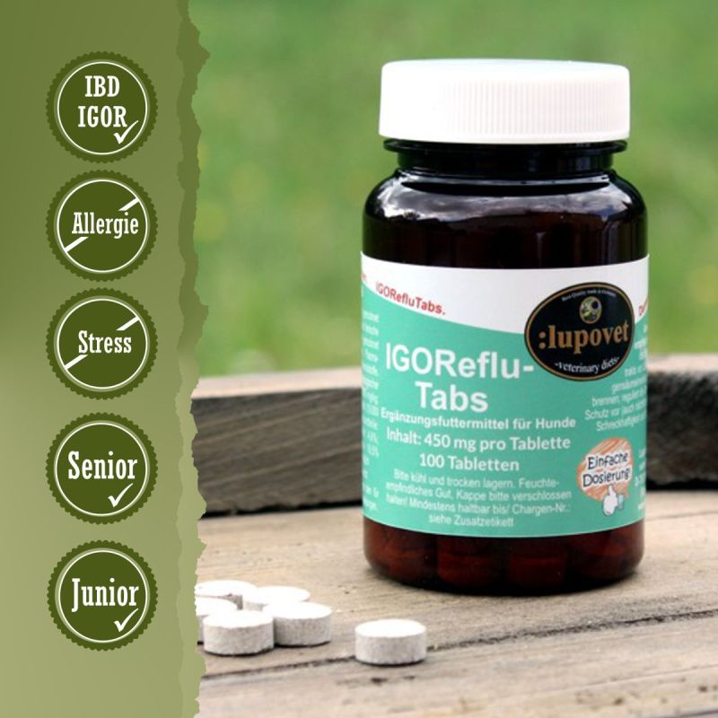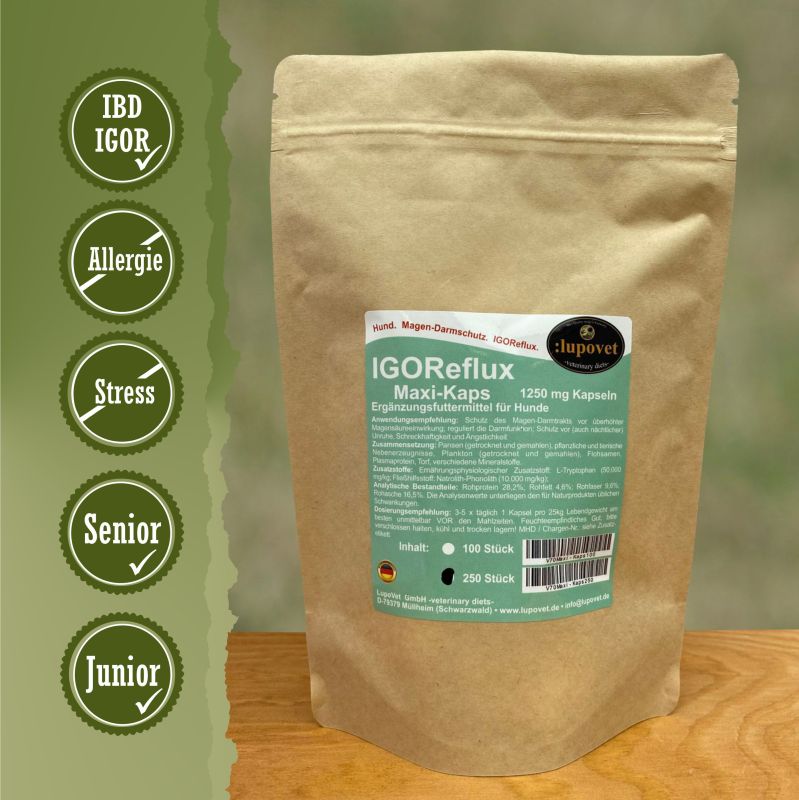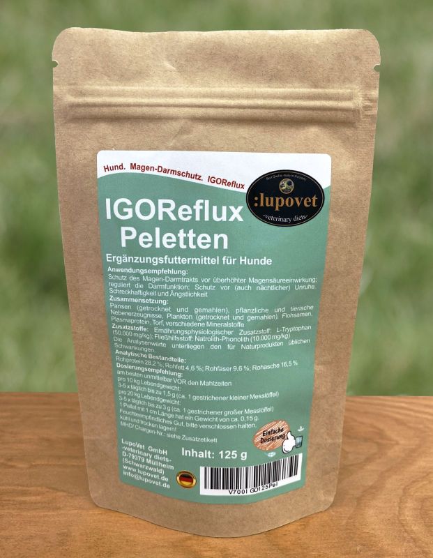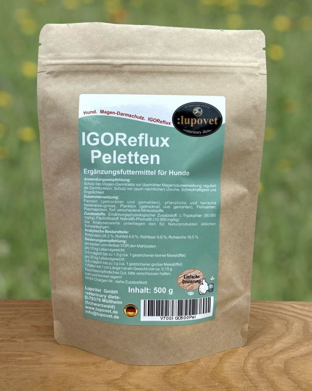 Ofrece una protección del tracto gastrointestinal contra el ácido estomacal excesivo y el ardor de estómago, regulando la función intestinal durante los procesos de diarrea. Los síntomas más visibles en el perro suelen ser: comer hierba, lamer en exceso las cosas, inquietud (también nocturna), y se les ve ansiosos y un comportamiento esquivo o radicalmente lo contrario. El término IGOR significa Inflammatorisch Gastro-Oesophagealen Refluxel psicosomático.